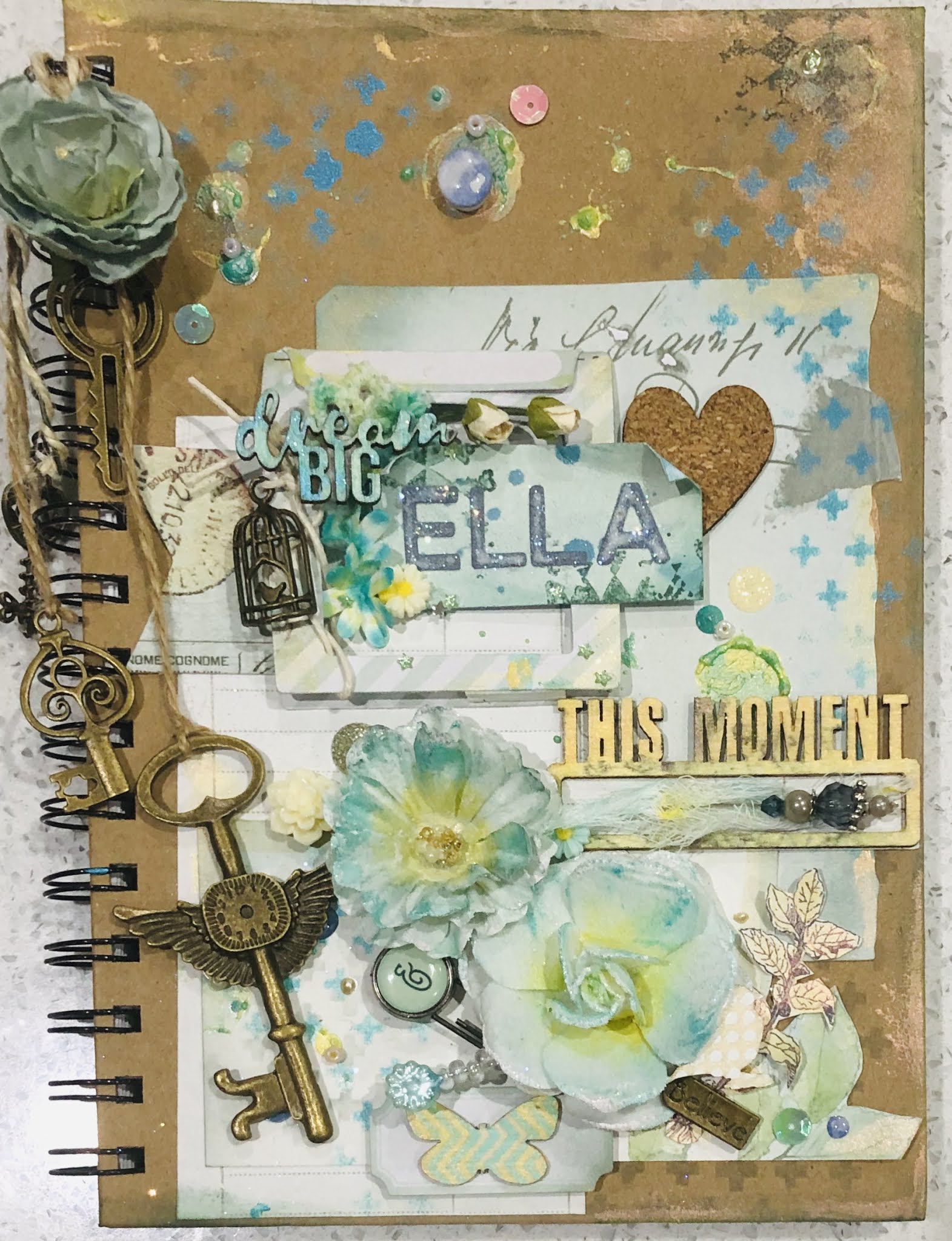 I tied twine to the spiral book binder which I attached metal keys to and a flower. I then started to position all embellishments so there was a balance for the eye on the cover.